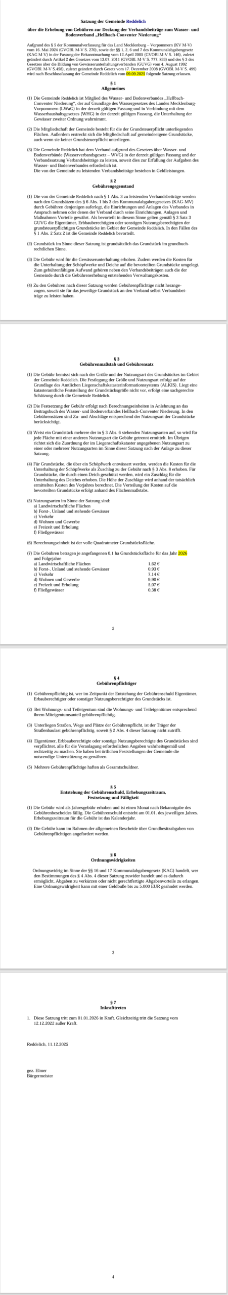 Satzung der Gemeinde Reddelich über die Erhebung von Gebühren zur Deckung der Verbandsbeiträge zum Wasser- und Bodenverband „Hellbach-Conventer Niederung“